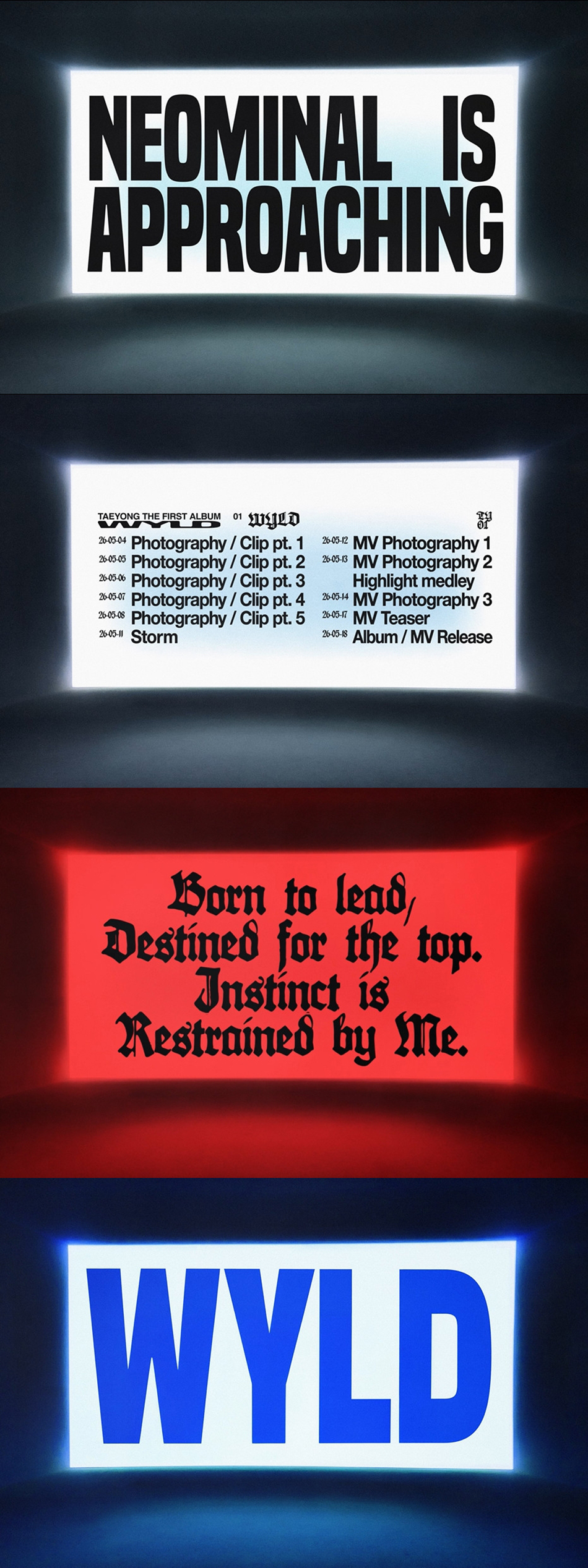 テヨンは5月4日から8日までティザーイメージとムードサンプラー映像で新コンセプトに変身した姿を披露し、13日のハイライトメドレー映像、17日のタイトル曲「WYLD」のミュージックビデオティザーへと続くコンテンツリレーを通じて、初の正規アルバムへの期待感を高めていく見通しだ。