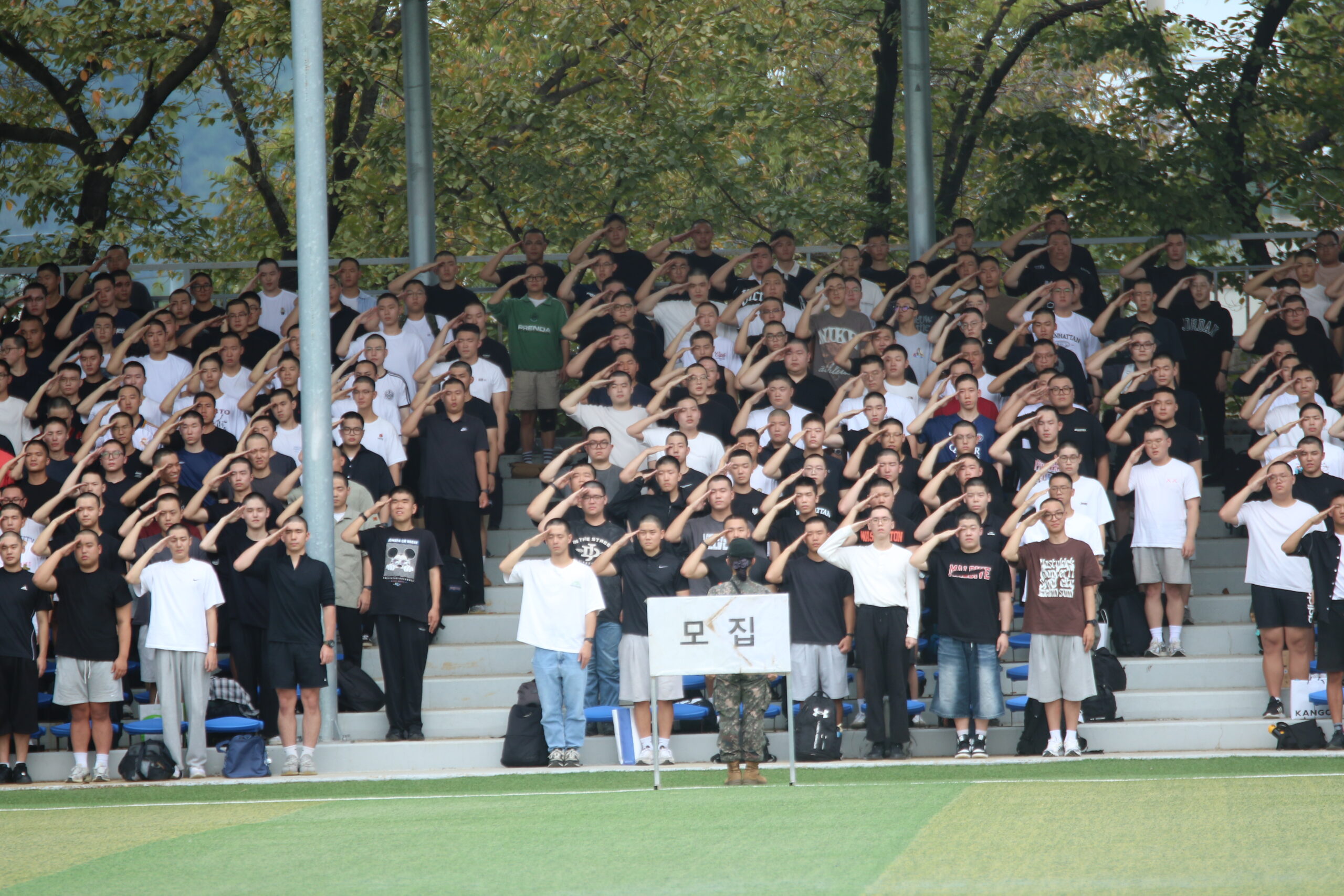 14時から入営式が始まった。全員が指定の場所に集まると、場内アナウンスが「敬礼」と指示を出す。まだ軍服も着ていない新兵たち全員がそのポーズを取ると、場内から拍手が起きた。これが本当の軍隊生活の始まりだからだ。彼らは後に基礎軍事訓練で敬礼の仕方から正しく学ぶ。だからこの時は家族の前で「ポーズ」だけでも取って見せるのだ。