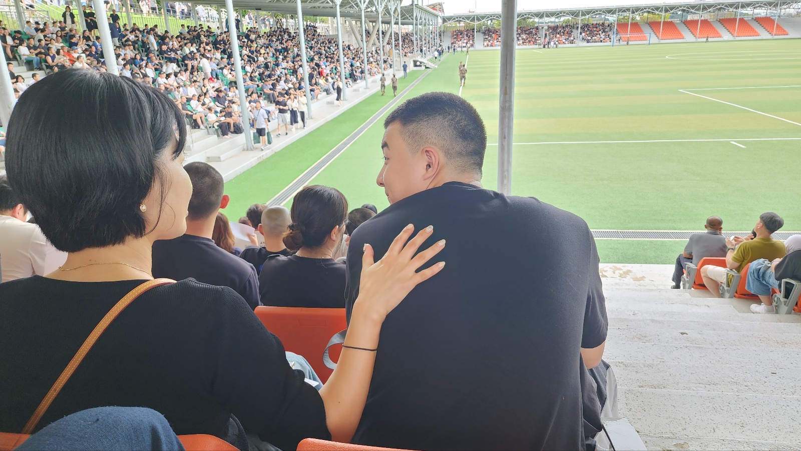 このアナウンスの声で、“軍隊生活”が始まる。Jくんは母と握手し、父のYさんは後ろの席でそれを見守る。多くの言葉はかけない。スタンドから他の新兵たちが、いったんグラウンドに降りて、ロープの貼られたスタンドの「集合場所」に向かう。