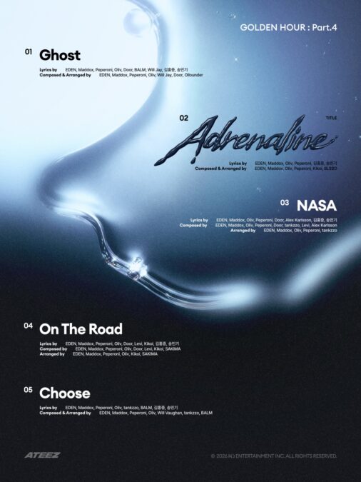 ATEEZが2月6日にリリースするミニアルバム13作目『GOLDEN HOUR : Part.4』のタイトル曲が「Adrenaline」に決定した。所属事務所KQエンターテインメントが韓国メディア向けのプレスリリースでこの内容を伝えている。