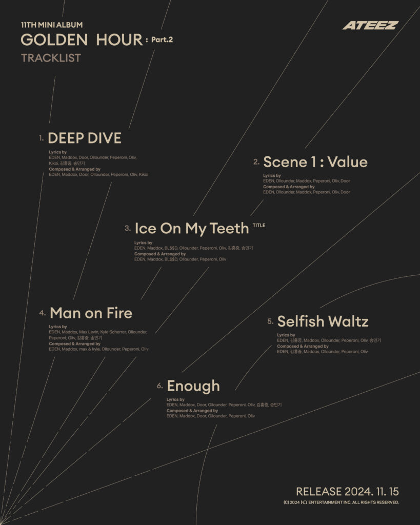 ATEEZが11月1日、15日に発売を控えた11枚目のミニアルバム「GOLDEN HOUR:Part.2」のトラックリストポスターを公開した…