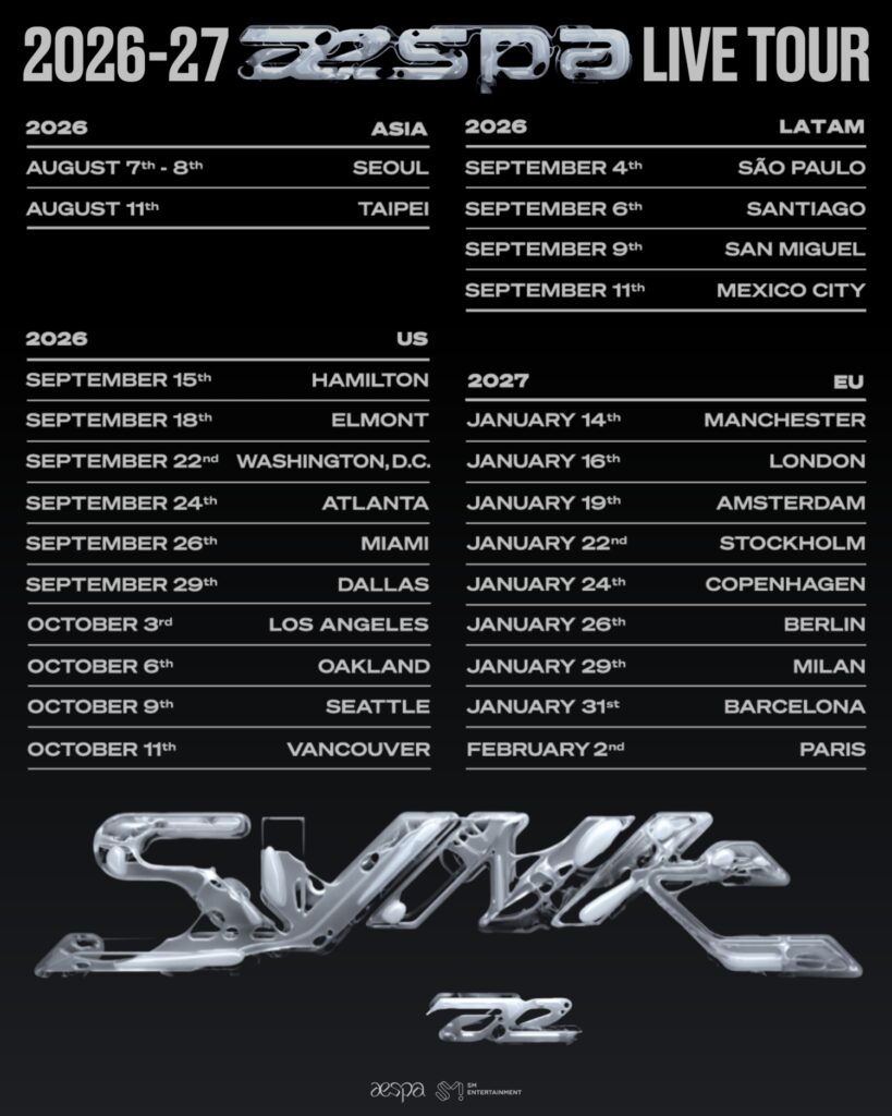aespa(エスパ、SMエンターテインメント所属)が、2026年から2027年にかけて開催される新ワールドツアーのスケジュールを発表し、話題…